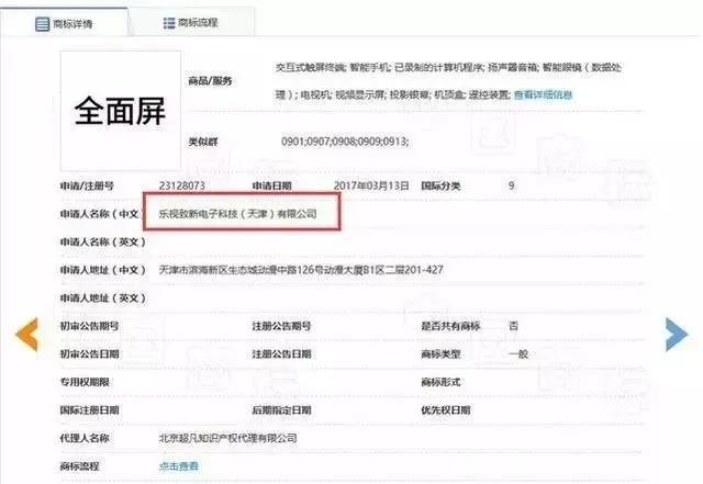 能够想到将“全面屏”这三个字注册成为商标的,却独有乐视一家!